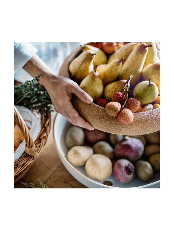 Elle présente les plus beaux fruits dans sa coupe en liège, tout en préservant dans sa base en céramique –– à l’abri des regards –– oignons, betteraves ou pommes de terre.