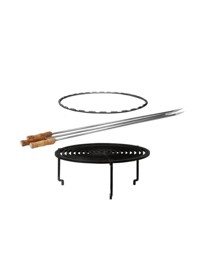 Le set comprend la grille ronde 85, l’Anneau Brochette Horizontal 85 et les brochettes 85.