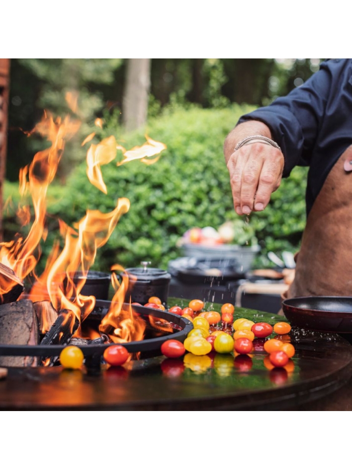 La conséquence est que des aliments comme les tomates peuvent rouler ou glisser au centre de la plaque de cuisson et tomber dans le feu. Pour éviter cela, l’OFYR Anneau de maintien a été développé.