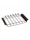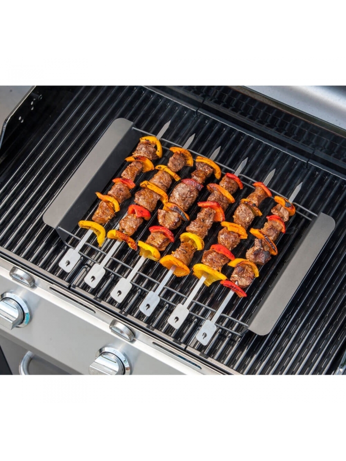 Le kit contient six brochettes et un support pour s'assurer qu'elles ne glissent pas entre les grilles du barbecue. Le support permet également d'éviter que les brochettes restent collées à la grille.