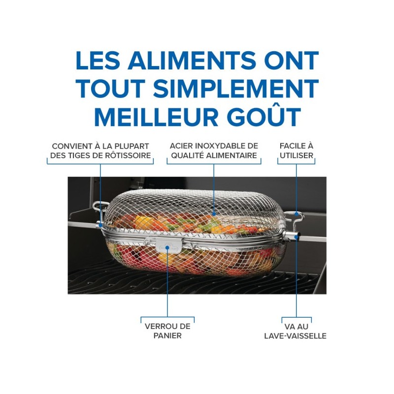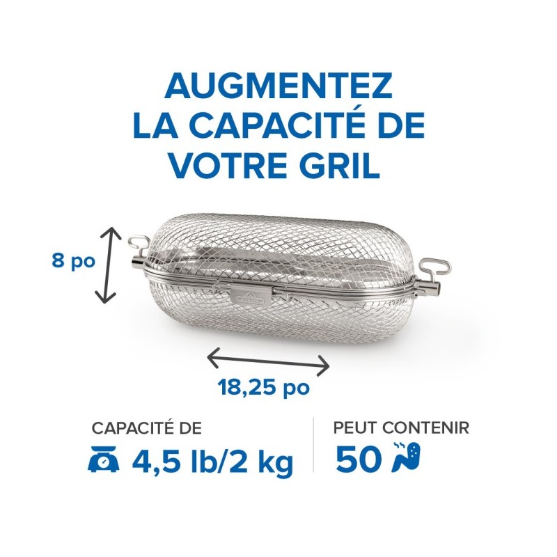 Les orifices du panier à rôtisserie s'adaptent à la plupart des styles de tiges de rôtisserie et se verrouillent à l'aide des vis à oreilles. Une fois que vous avez créé les ailes les plus délicieuses, les frites les plus croustillantes et les légumes grillés sans ajout d'huile, les paniers en acier inoxydable se nettoient facilement, puis s'emboîtent pour un rangement peu encombrant.