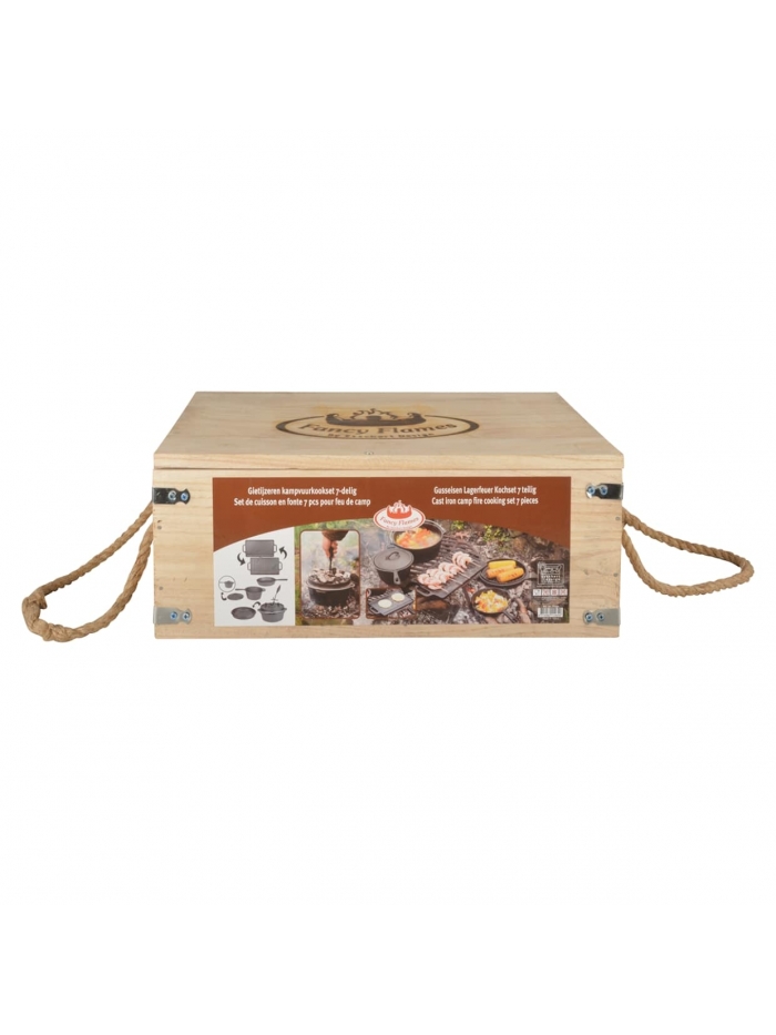 Toutes ces pièces sont emballées dans une caisse en bois munie de poignées en corde, ce qui vous permet de prendre facilement l'ensemble avec vous. En même temps, la caisse offre de l'espace pour des ustensiles de cuisine supplémentaires.