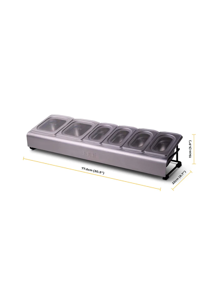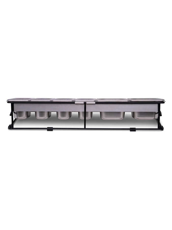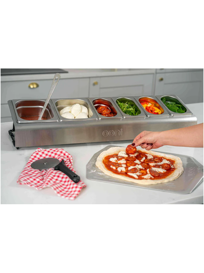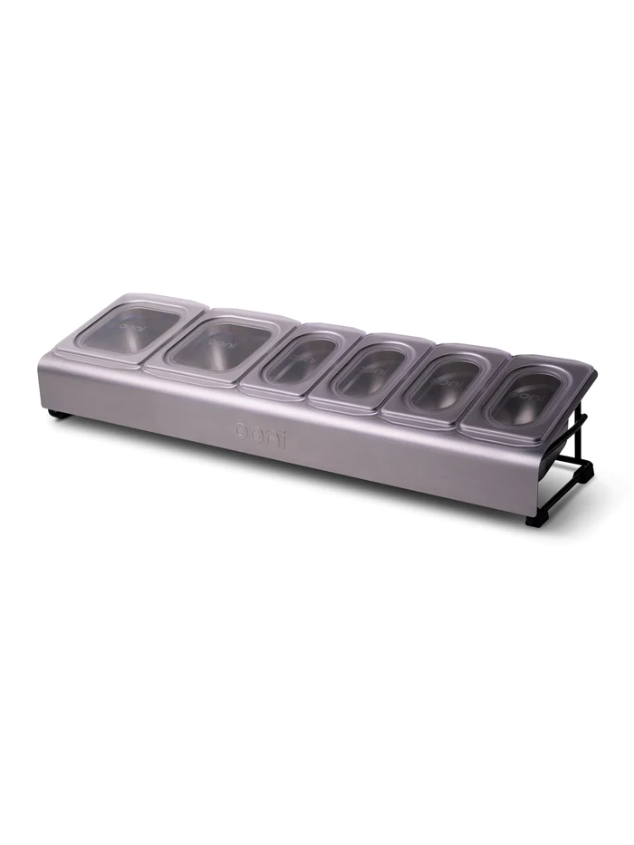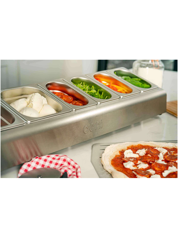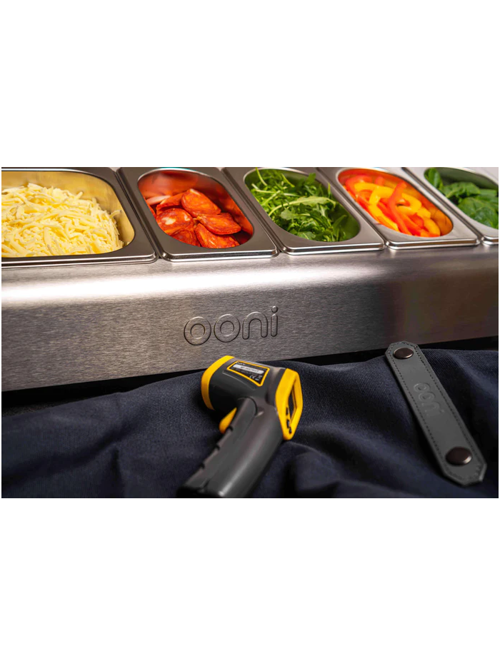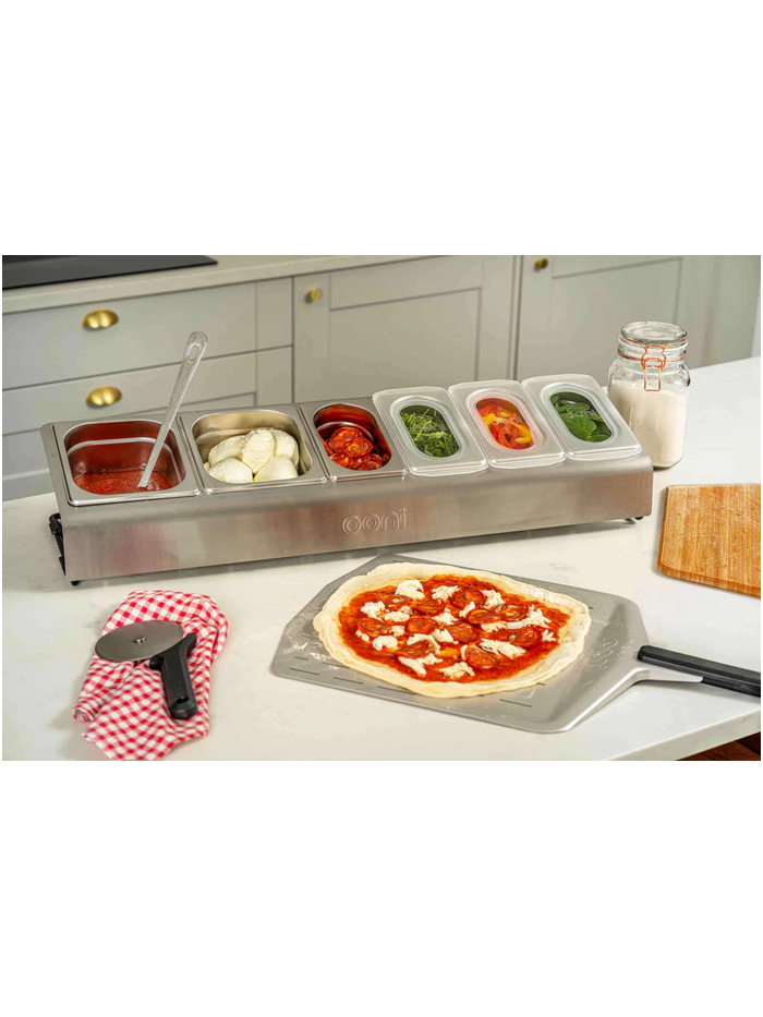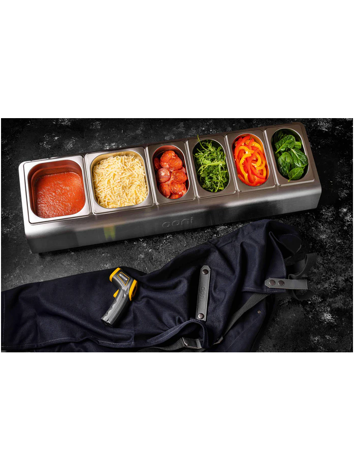 Avec les deux bacs de 1,6 L et les quatre bacs de 0,8 L de la saladette Ooni, vous aurez toujours assez de garnitures pour préparer autant de pizzas que vous le souhaitez. Les couvercles transparents et sur mesure de chaque bac te permettent de les empiler et les ranger facilement dans le réfrigérateur. L'armature avec revêtement en poudre résistante aux intempéries et le couvercle en acier inoxydable sont parfaitement adaptés aux tables modulaires Ooni.