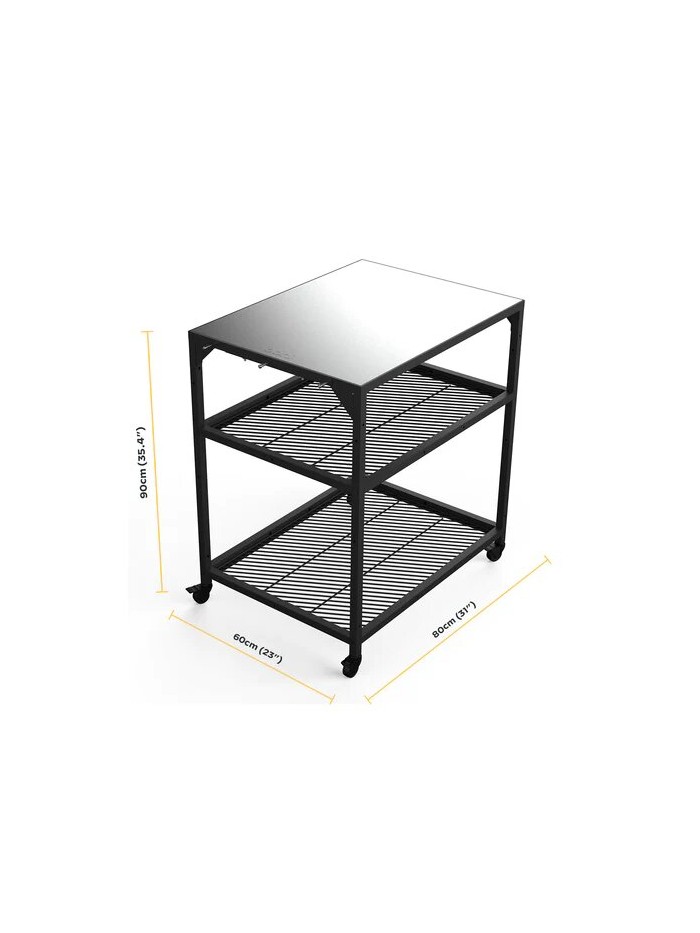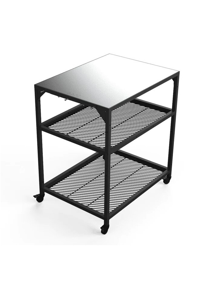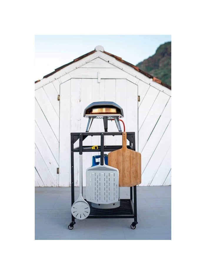 Les tables sont fabriquées en acier au carbone avec revêtement en poudre résistant. Les tables Ooni sont fabriquées en acier au carbone avec revêtement en poudre résistant. Elles sont dotées de deux étagères réglables en hauteur et de crochets intégrés sur lesquels vous pourrez accrocher les pelles et autres accessoires Ooni. De plus, les deux roulettes à position verrouillable vous garantiront une stabilité maximale lors de la cuisson.