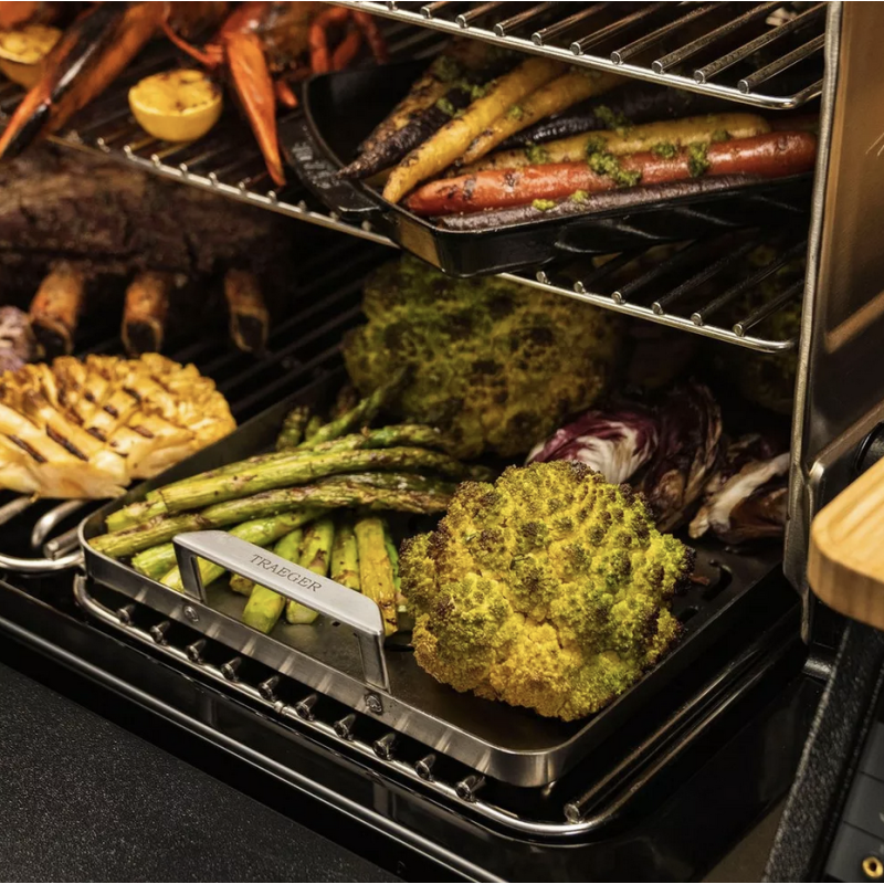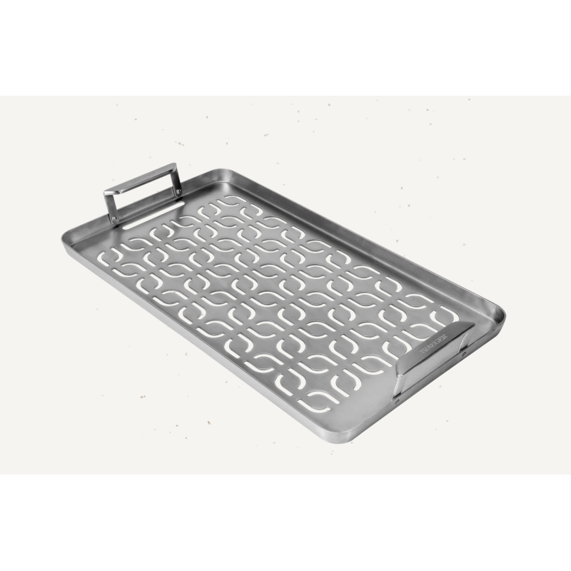 Ne perdez plus jamais de crevettes ou de tranches de poivrons à travers les grilles du gril. Le plateau en acier inoxydable ModiFIRE® Fish & Veggie Grill Tray empêche les légumes coupés, les boulettes de viande et autres petits aliments de tomber dans le feu.