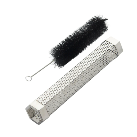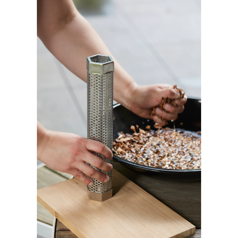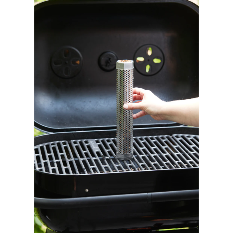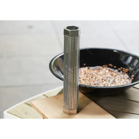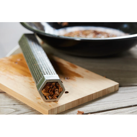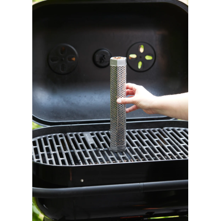 Le tube de fumage offre une saveur fumée intense et durable. Compatible avec les pellets et les copeaux de bois, il produit de la fumée pendant jusqu’à 4 heures. Le nettoyage est facile grâce à la brosse incluse.