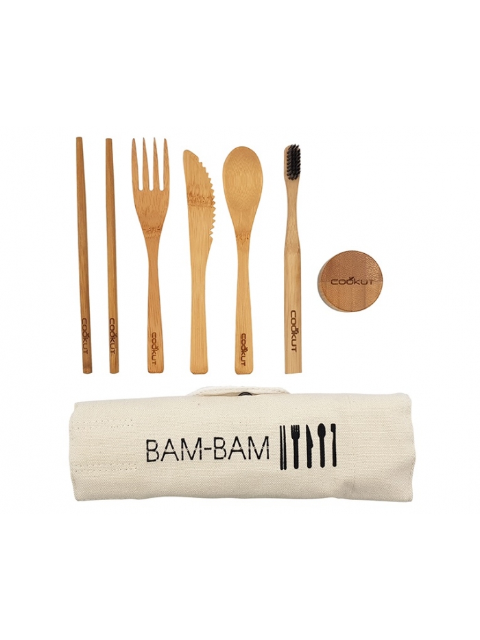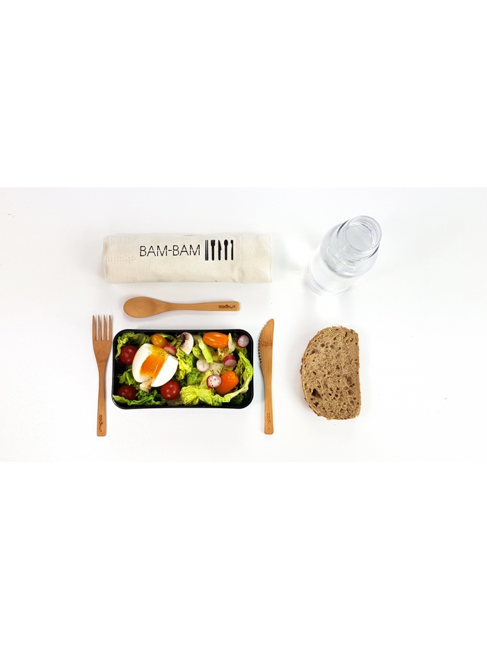Le kit repas Bam Bam est composé de couverts en bambou, d’une brosse à dents en bambou et d’un petit pot à dentifrice en verre et bambou.