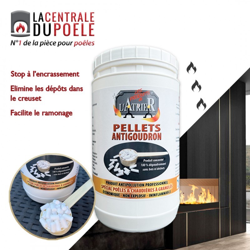 Mesurettes une fois par semaine pour Plusieurs semaines de traitement - nous vous conseillons 2 boites par saison de chauffe. Spécialement conçu pour l'entretien des poêles et chaudières à granulés, sans arrêt de chauffe. Au contact du feu, les pellets anti-goudron provoquent une réaction catalytique à l'intérieur du foyer et du conduit de fumée qui dessèche rapidement le goudron et la suie. La déshydratation fait décrocher les dépôts sans les brûler.