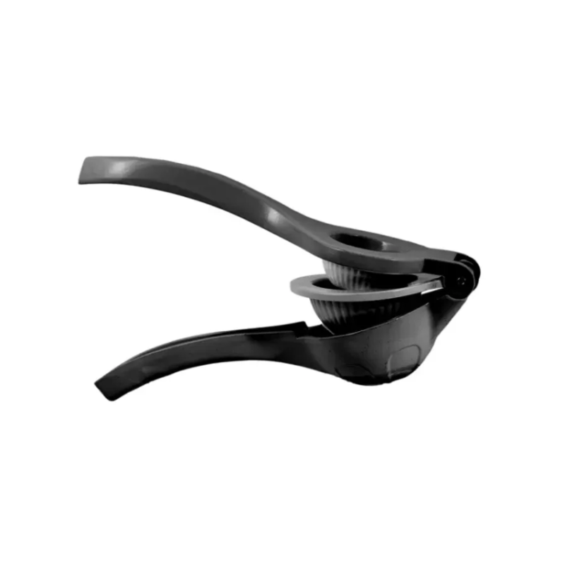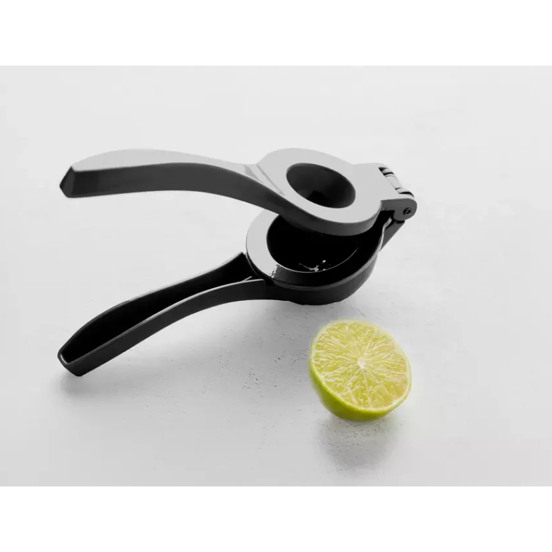 Un presse-agrumes robuste et élégant en aluminium noir, idéal pour extraire facilement le jus de vos citrons et citrons verts sans effort ni pépins.