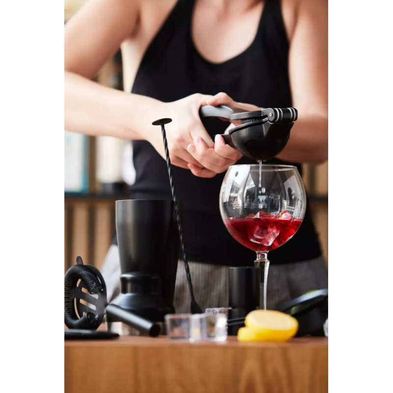 Avec sa finition noire moderne et son design ergonomique, ce presse-agrumes allie style et efficacité. Compact et facile à ranger, il trouve naturellement sa place parmi vos accessoires de cuisine ou de mixologie.