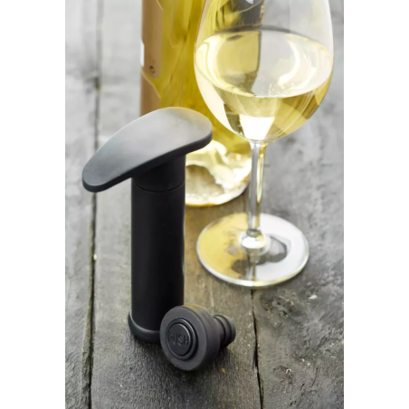 Humidifiez le bas du bouchon avec de l'eau, insérez le bouchon dans votre bouteille de vin que vous souhaitez conserver comme vous ferez avec un bouchon classique. Placez la pompe vide-air dessus et pompez plusieurs fois pour vider l'air à l'intérieur de la bouteille, lorsque vous sentez une résistance, il n'y a plus d'air dans la bouteille.