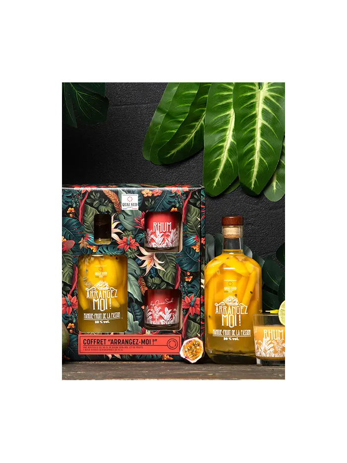 COFFRET ARRANGEZ-MOI MANGUE – FRUITS de la PASSION, BOISSON SPIRITUEUSE à base de 50 cl de rhum des Caraïbes 30% vol. + 160 g de fruits.
