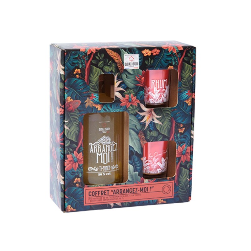 Un splendide coffret “jungle”, le choix parmi 3 parfums (Mangue-Passion, Ti-Punch ou Banane-Ananas-Coco) incluant 2 verres sérigraphiés dédiés à la dégustation de rhum. L’élégance Antillaise dans un coffret flamboyant !