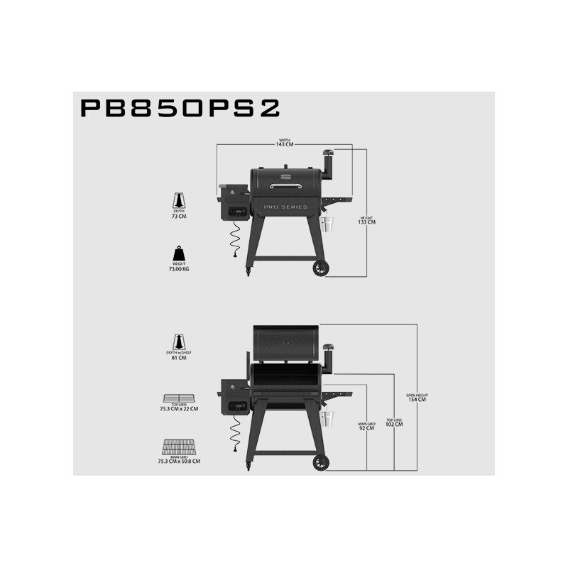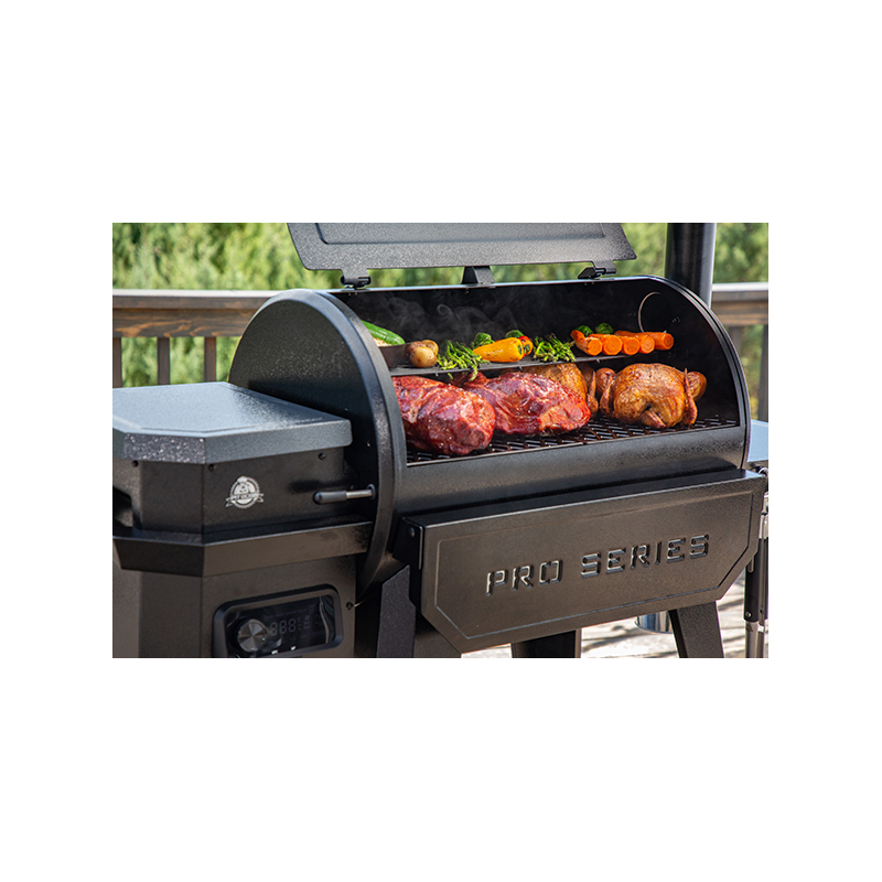Le PB850PS2 vous offre notre variété de cuisson 8-en-1 renommée pour saisir, fumer, faire griller, rôtir, braiser, cuire au four et griller au charbon de bois. Le barbecue à granulés en bois PB850PS2 a une surface de cuisson de 5 484 cm2 avec deux niveaux de grilles de cuisson amovibles.