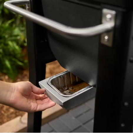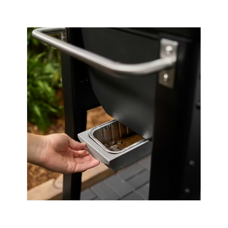 Le système intégré de gestion des graisses et des cendres vous permet de nettoyer rapidement et facilement avec moins de saletés et sans aspiration. Il suffit de gratter la graisse et de balayer ou de racler les cendres vers le bac de récupération, de retirer le bac et la lèchefrite jetable et de les jeter.
