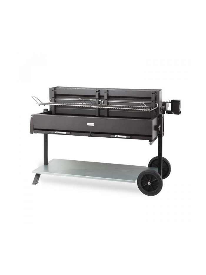 Côté horizontal avec deux grilles réglables sur 3 niveaux Foyer vertical avec un tournebroche, un moteur électrique force 50kg (2t/min), une broche à lardoires et une lèchefrite inox pour receuillir les jus de cuisson Chariot avec deux grandes roues, deux poignées Cuve et deux tiroirs à cendres en version acier peinture epoxy noir Chariot en version acier époxy noir et plateau inférieur en inox Fonctionne au charbon de bois uniquement