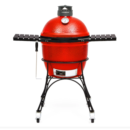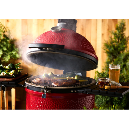 - Autres caractéristiques et accessoires inclus : Loquet en acier inoxydable, foyer AMP, grilles de cuisson en acier inoxydable, thermomètre intégré, tablettes latérales rabattables en acier revêtu de poudre/poignée et outil à cendres.