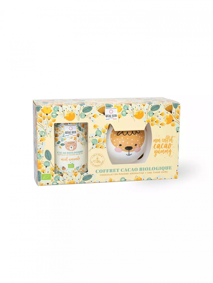 Si Winnie l’Ourson était le héros de votre enfance, ce coffret gourmand est pour vous ! Les coffrets Yummy de Quai Sud réunissent un délicieux cacao bio aromatisé et une tasse toute mignonne pour un instant de dégustation plein de tendresse . Nous avons donc associé dans ce joli coffret décoré de fleurs printanières un savoureux chocolat en poudre aromatisé au miel et à l’amande, avec une tasse choupinette ornée d’un ours ! Un coffret cadeau aussi beau que bon qui rendra vos pauses gourmandes et savoureuses.