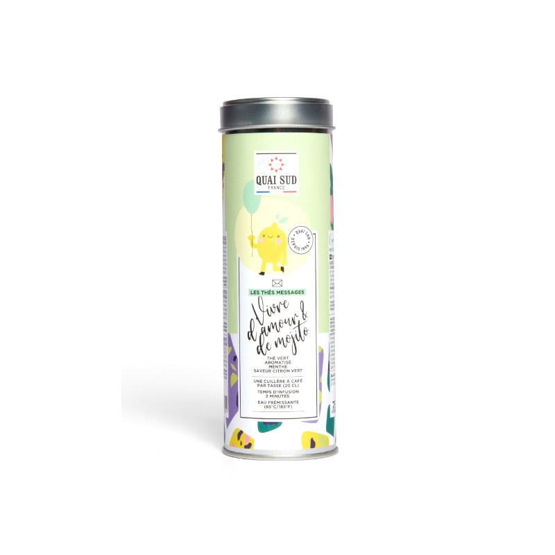 Offrez le thé Vert Message “Vivre d’Amour & De Mojito” : un breuvage festif aux notes cubaines de menthe fraîche et écorce de citron. Un cadeau unique pour égayer les palais, été comme hiver!