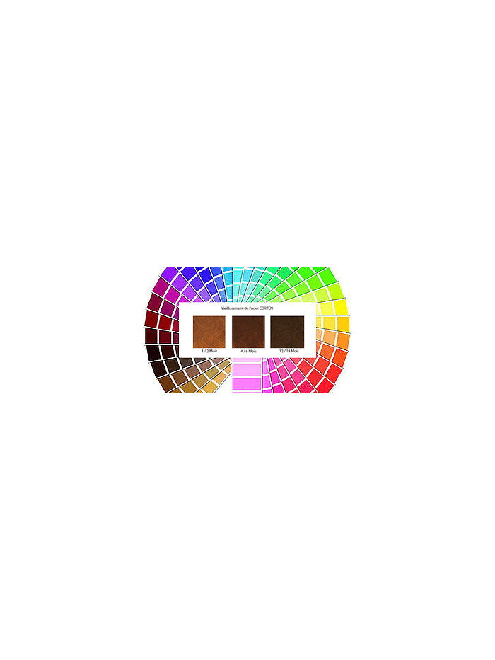 Disponible en de nombreux coloris, lisse ou sablé, mat ou brillant, par thermolaquage (peinture époxy). Ou en acier Corten. L’acier Corten à la particularité de rouiller en surface, il fait pour ça. Il s’agit donc d’une vraie rouille, brunissant et se patinant avec le temps.