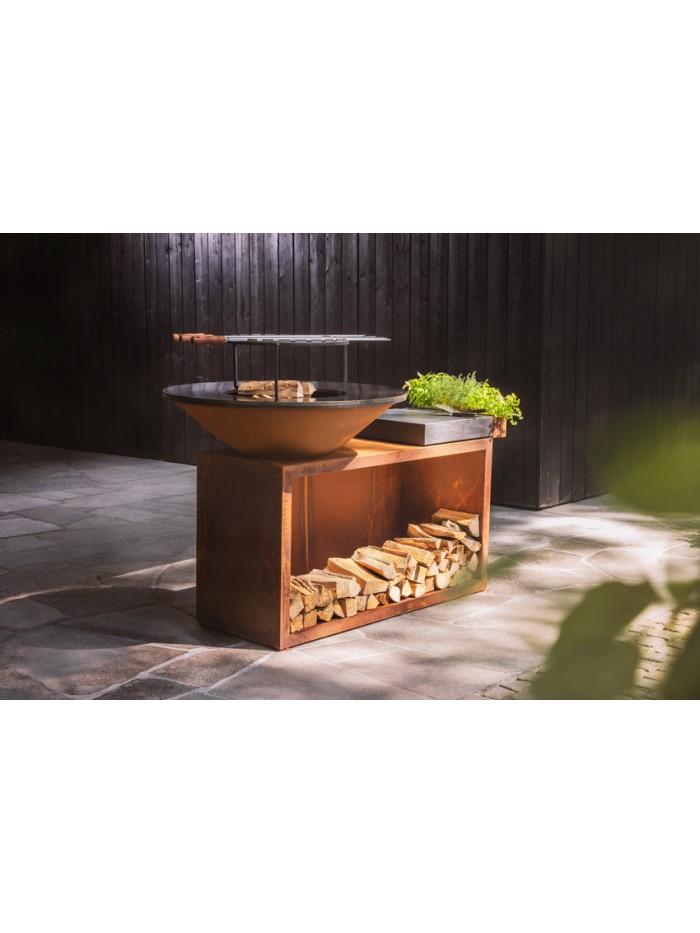 Ce produit tout-en-un combine style indétrônable et fonctionnalité. Fabriqué en acier laqué, il comprend une plaque OFYR 100, un grand socle pour le stockage des bûches, un solide plan de travail en céramique et un bac de rangement utile pour les ustensiles et les condiments.