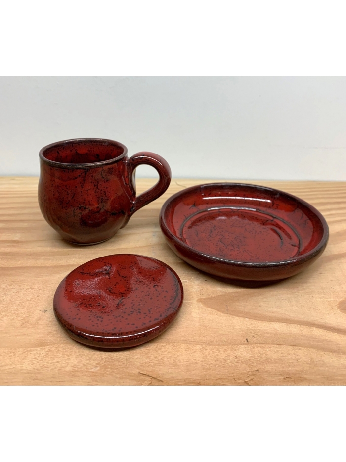 1. La tasse en grès est remplie de café froid, posée dans la soucoupe.
