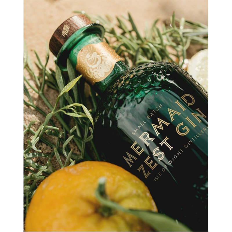 Inspiré par l'île luxuriante et verdoyante, ses herbiers et la nature, le Mermaid Zest Gin est présenté dans un classique vert émeraude. Infusé avec de la salicorne côtière et du romarin récoltés le long des côtes de l’île ainsi qu’avec des fruits cultivés dans le jardin clos victorien de Osborne House, la maison de la reine Victoria et du prince Albert.