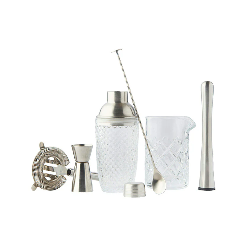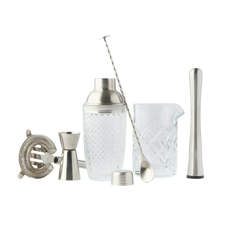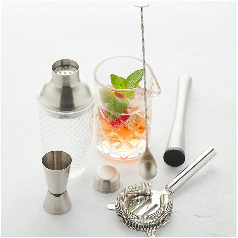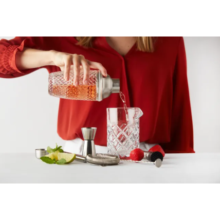 Un coffret à cocktail complet et élégant en verre et acier inoxydable, idéal pour préparer et servir vos boissons avec style lors de moments conviviaux.