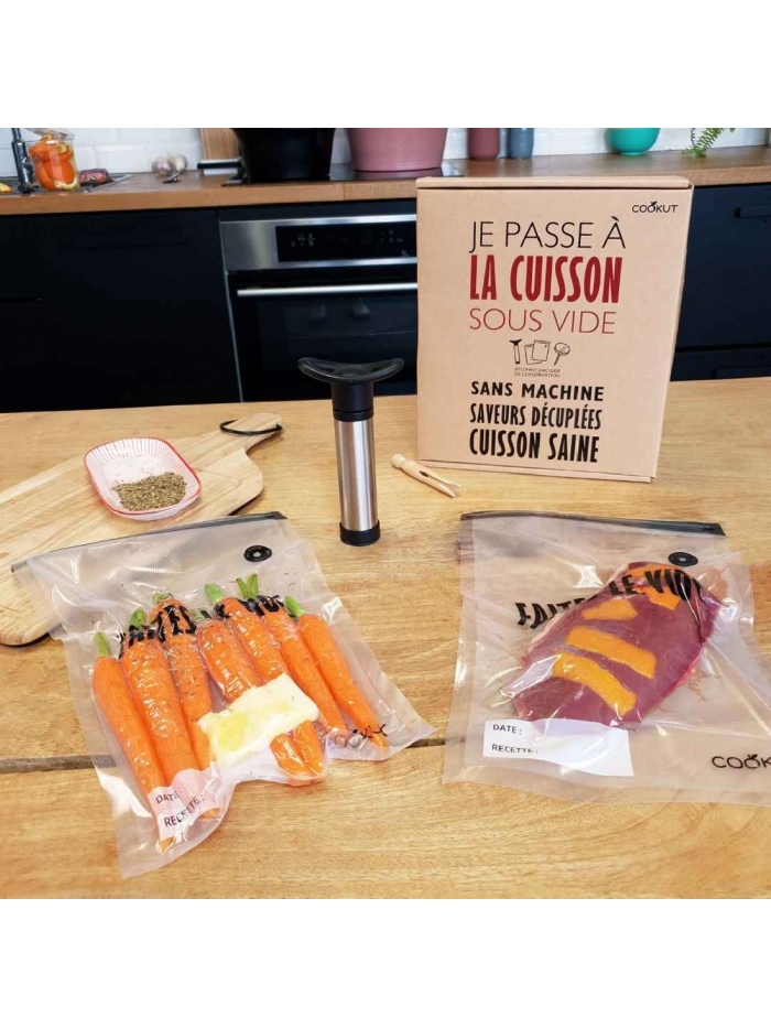 Ce coffret contient une pompe manuelle de mise sous vide, 5 sacs de cuisson lavables sans BPA, un thermomètre de cuisson spécial sous vide, deux pinces pour le maintien lors de la cuisson et le livre de recettes pour préparer des viandes, des poissons, des légumes et des fruits...