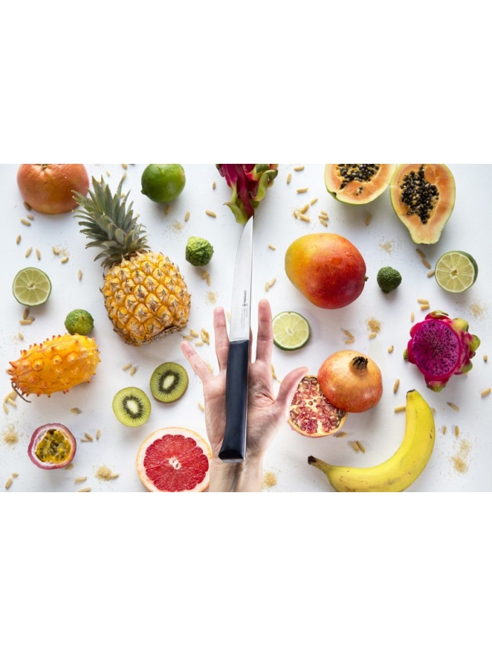 Entre l'office et le Chef. Avec une fourchette il découpe rôtis, gigots et volailles. D'une grande maniabilité il est aussi efficace pour trancher les fruits et les légumes.