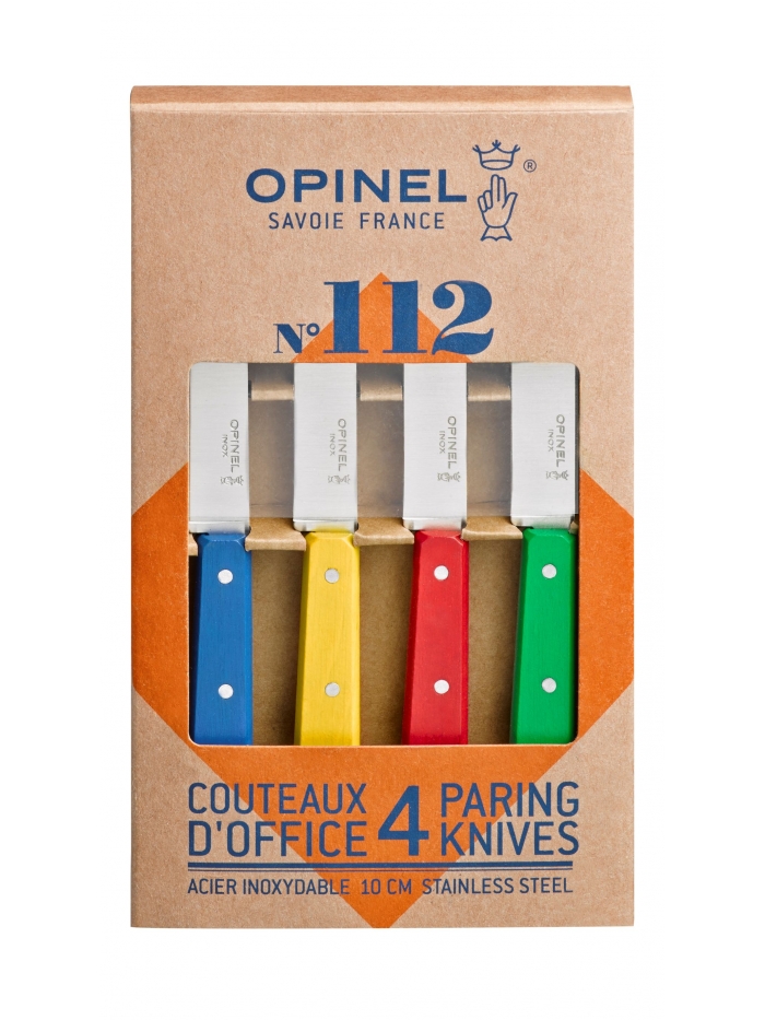 Le coffret regroupe 4 couteaux d'Office N°112, le petit couteau polyvalent indispensable pour peler fruits et légumes, trancher, émincer.