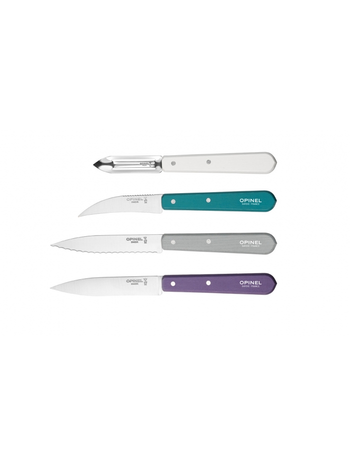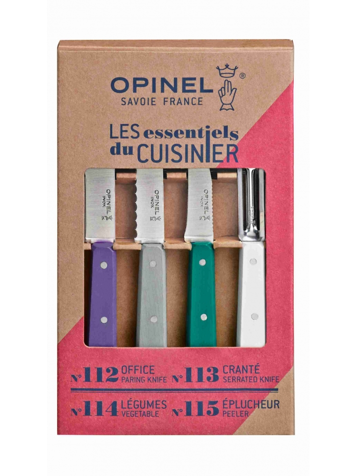 Les essentiels du cuisinier sont les petites lames indispensables dans la cuisine : le couteau d'office, le couteau cranté, le couteau à légumes et l'éplucheur. Aujourd'hui disponible dans un panache de couleur inspiré du style Art déco : violet, gris clair, vert émeraude et blanc. Manche en charme teinté et verni, lames en acier inoxydable et coffret carton.