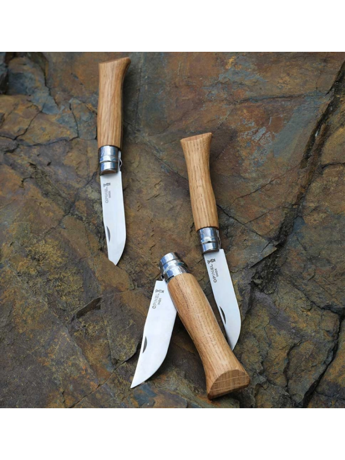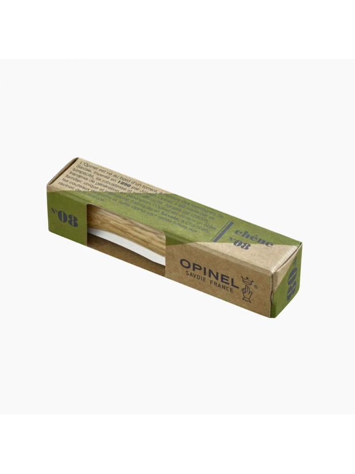 Le n°8 chêne Opinel dispose d'une lame en acier inoxydable 12C27 lui confère une haute résistance à l'abrasion et lui permet de trancher des materiaux très durs. Le profil bombé de sa lame réduit l'effort de coupe.