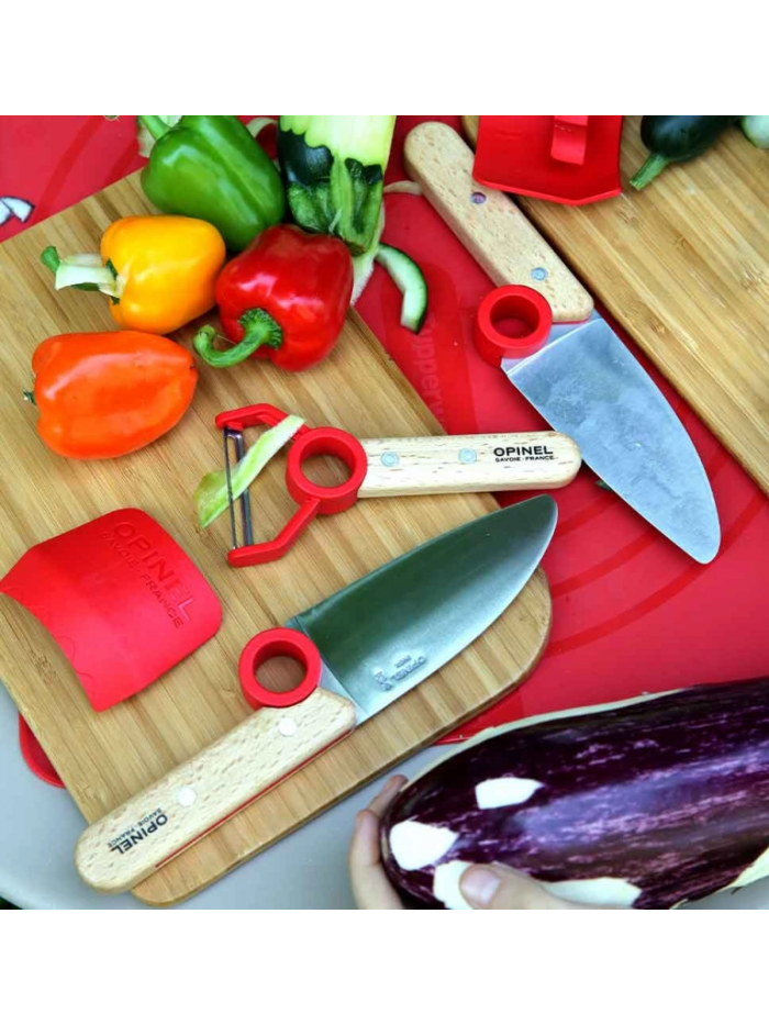 Les enfants cuisinent avec Opinel : la collection Petit Chef est idéale pour apprendre aux enfants à cuisiner. L'anneau pédagogique aide à bien positionner les doigts, le protège-doigts permet de protéger la main qui tient l'aliment à couper.