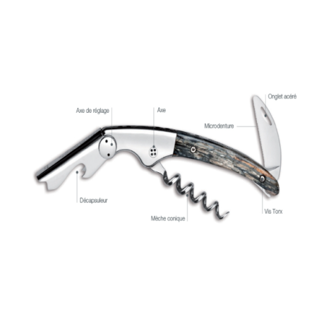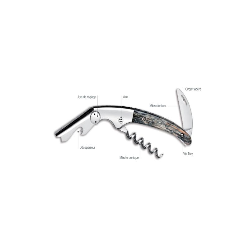 Ce sommelier possède une mèche conique ce qui permet d’ouvrir délicatement les vieilles bouteilles sans casser le bouchon. Il possède un coupe capsule et son crapeau fait également office de décapsuleur.