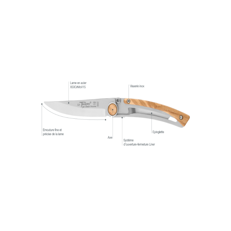 Enfin, les couteaux de poche Liner Le Thiers sont intégralement fabriqués dans les ateliers du maître coutelier Claude Dozorme. Les couteaux Claude Dozorme sont garantis 100% fabriqués en France, dans le respect de la tradition coutelière.