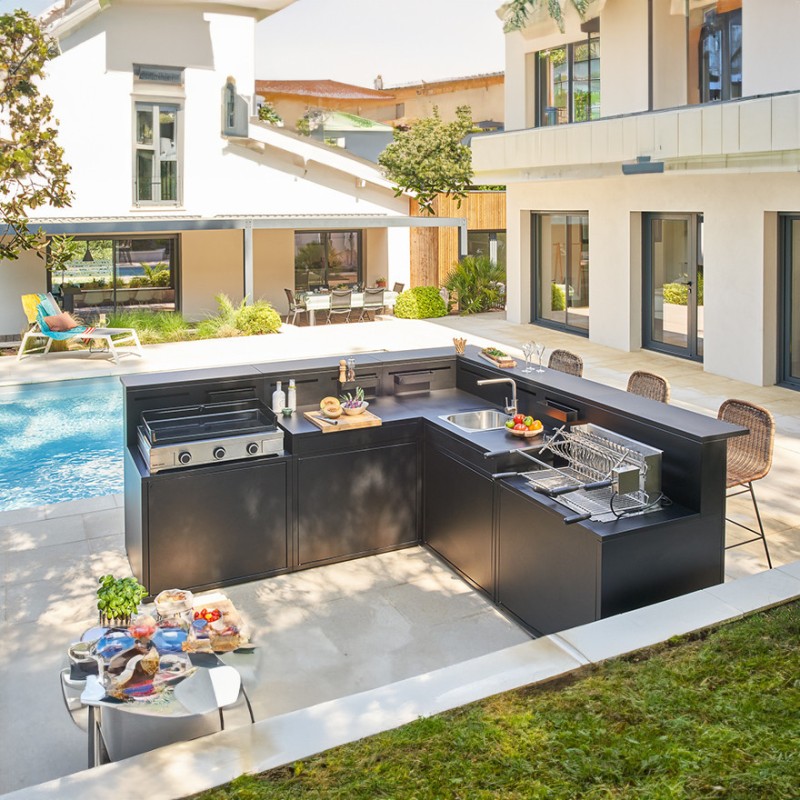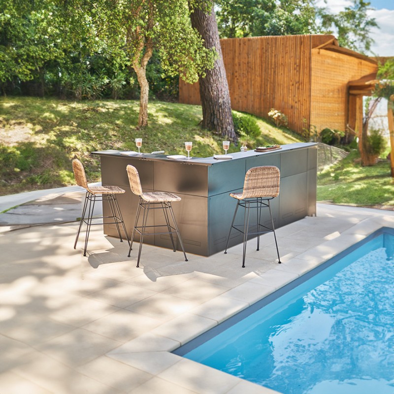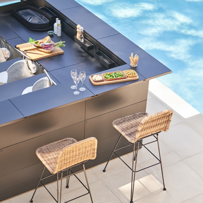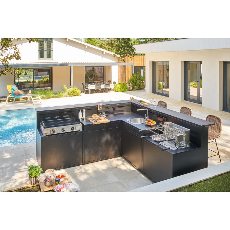 C'est tout le savoir-faire, le design et l'ADN de Forge Adour que l'on retrouve dans nos meubles de cuisine extérieure. La convivialité est à son paroxysme ! Amis épicuriens, composez, jouez, pour créer votre cuisine d'été, celle qui accueillera tous vos convives autour de son comptoir-bar pour des moments de partage et de fêtes mémorables. Car désormais, la cuisine d'extérieur se conçoit avec autant d'envie et d'exigence que la décoration intérieure, la tendance industrielle et le total look noir investi le jardin. En acier noir, nos meubles de cuisine extérieure bénéficient du revêtement 3 couches qui leur confère une meilleure résistance aux chocs, aux UV et à la corrosion.