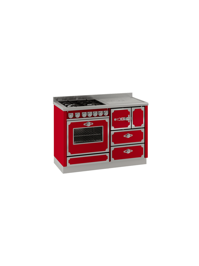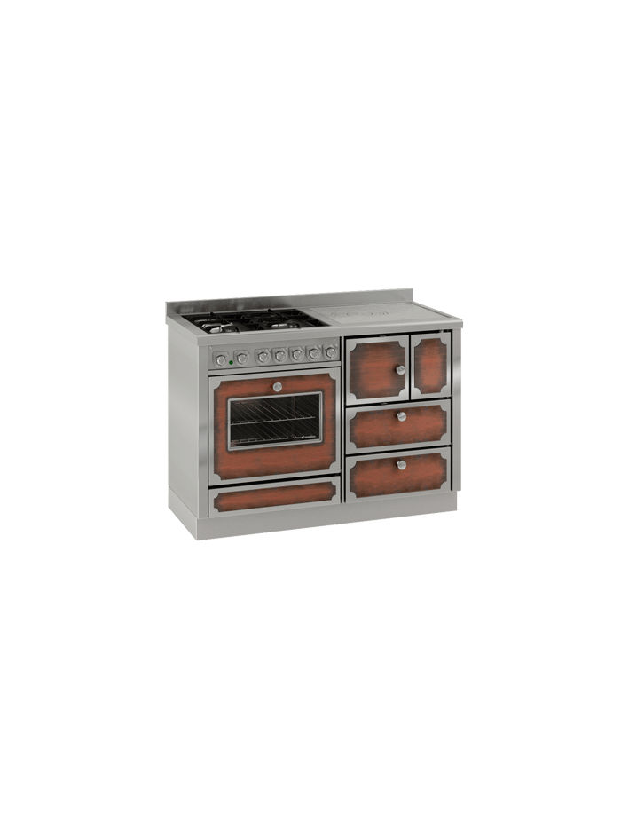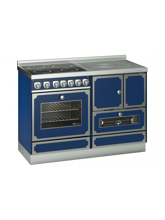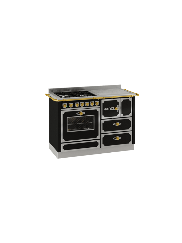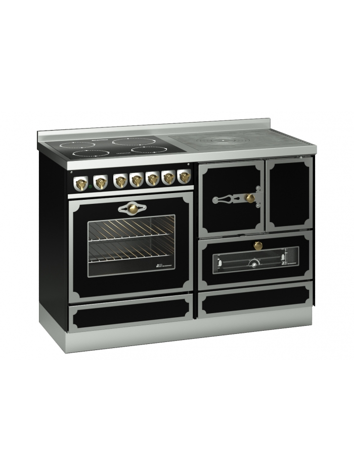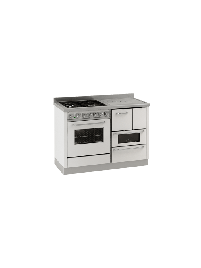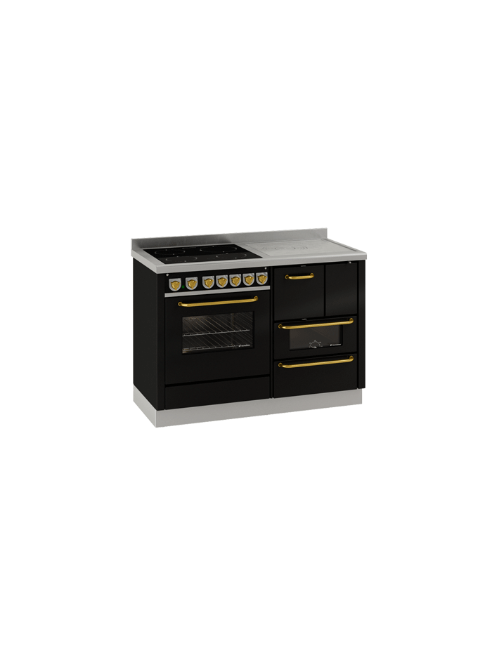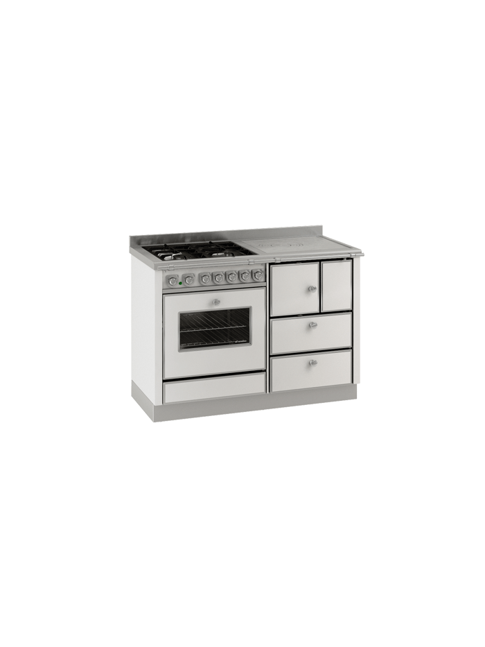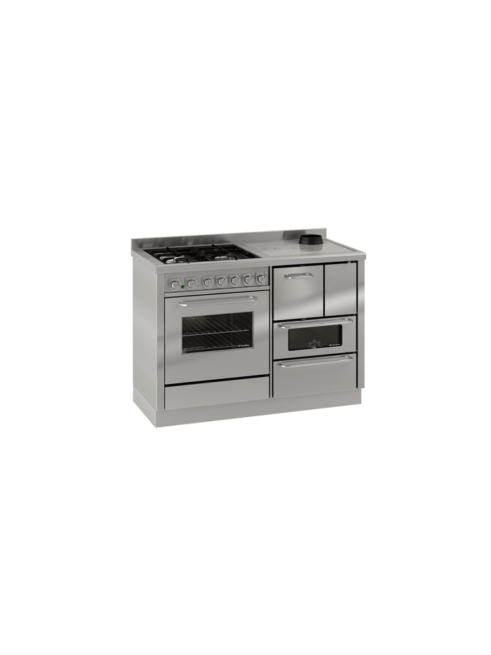 Cuisinière à bois modèle F60 combinée à droite ou à gauche avec une cuisinière au gaz modèle G60.