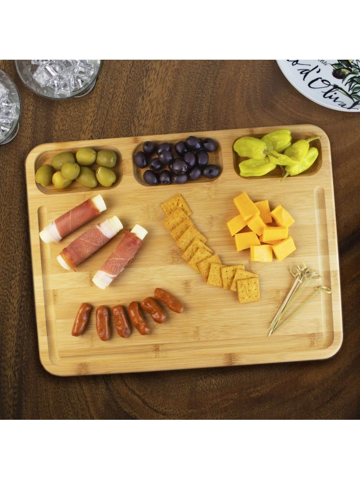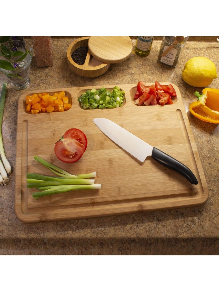 L'autre côté de la planche possède trois compartiments profondes pour contenir soigneusement les ingrédients une fois qu'ils sont hachés. Les compartiments en font également un fantastique plateau de charcuterie car ils peuvent être utilisés pour servir des craquelins et d'autres accompagnements aux délicieuses viandes et fromages du plateau.