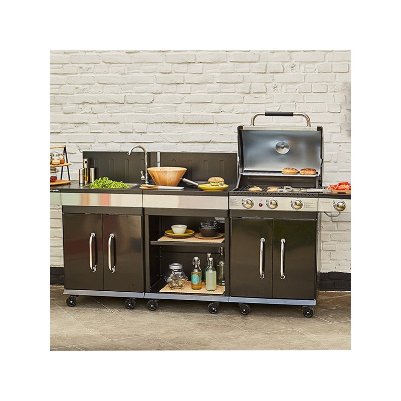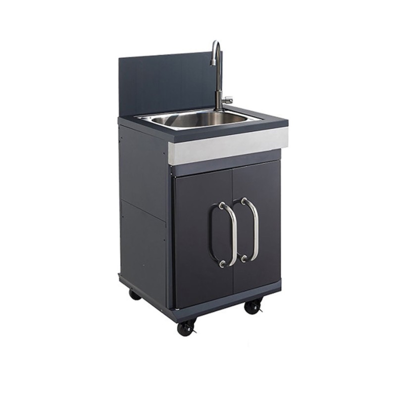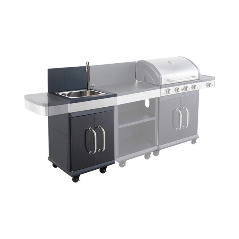 Avec l'évier de la gamme Fidgi, vous pourrez agrémenter votre barbecue (Fidgi 3 ou 4) d'une zone de rinçage qui vous permettra de laver vos aliments avant de les passer au barbecue. Le rangement inférieur avec portes pourra, lui, servir d'espace de stockage pour vos ustensiles ou assaisonnements. L'évier, tout comme le barbecue, est aussi déplaçable à l'infini grâce à ses 4 roues multidirectionnelles avec freins.