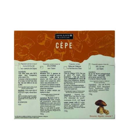 La moutarde aux cèpes ajoute une profondeur terreuse à vos viandes et sauces, tandis que le sel aux cèpes rehausse vos mets d'un goût authentique et subtil.