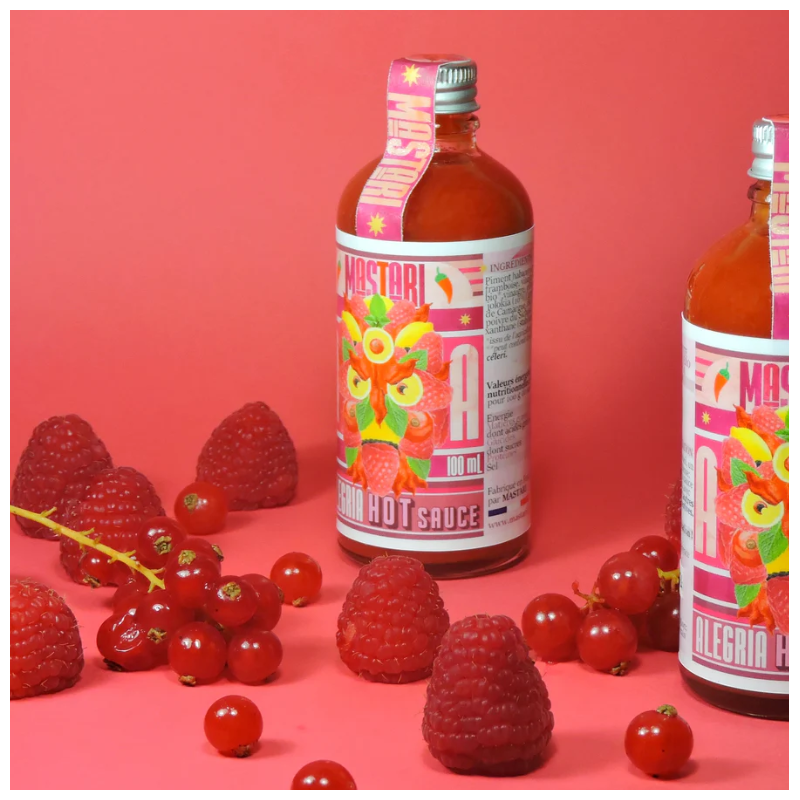 Découvrez la sauce piquante Alegria, un mélange harmonieux de piment habanero et jolokia, framboises, groseille et menthe.
