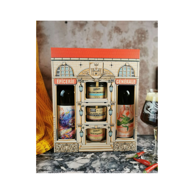 Découvrez le coffret Les Pavés d'Angoulême par Maître Cochon et la brasserie La Débauche, un joli coffret aux couleurs d'Angoulême composé de 2 bouteilles de bière 75cl et 3 pots de pâté de 90g.