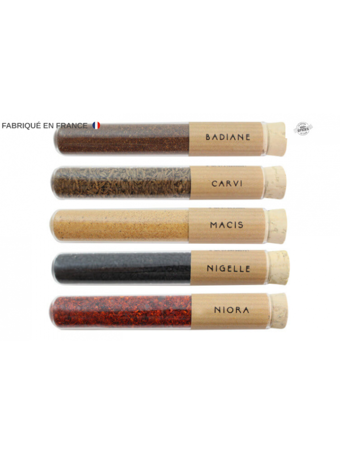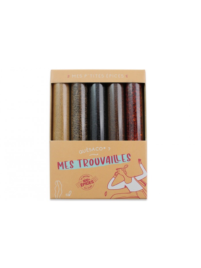 Ce coffret "Mes trouvailles" vous propose 5 mini tubes d'épices rares à cuisiner. De quoi apporter de nouvelles saveurs à vos plats du quotidien ! Ces tubes se ferment grâce à des bouchons en liège pour une conservation totalement hermétique de vos épices. Fraîcheur garantie !