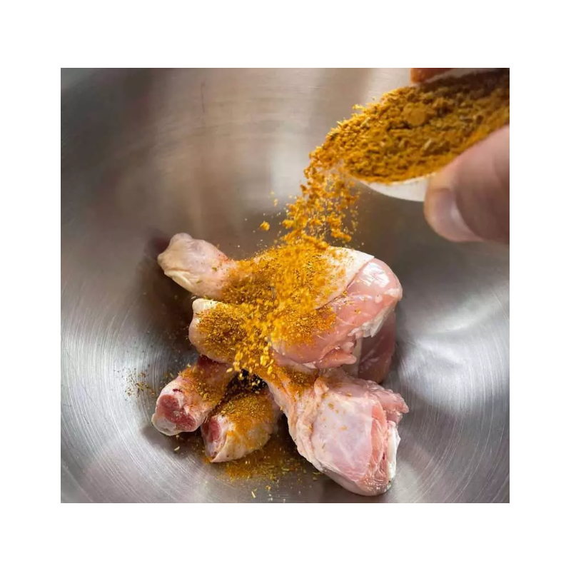 Composé d'épices en poudre de qualité et d'aromates comme du Paprika Fumé, des Oignons grillés, du Curcuma, de l'Origan, de l'Ail en poudre, du Poivre, du Laurier, du Romarin, du Thym