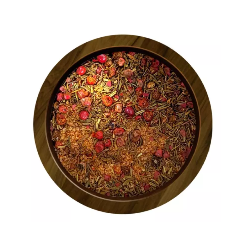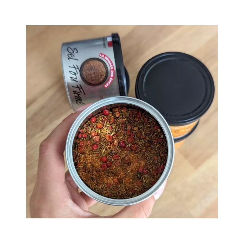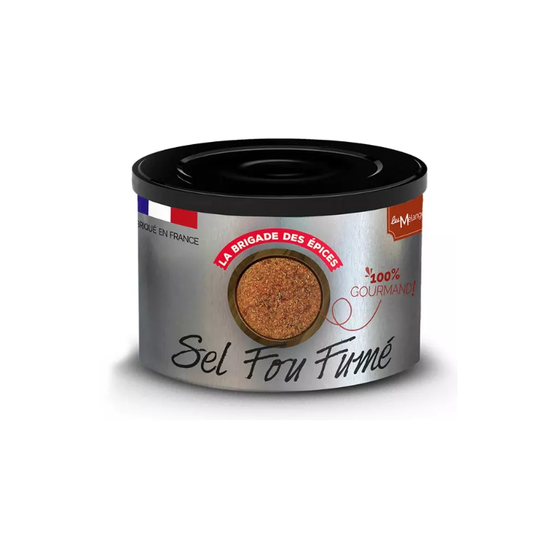 Le Sel Fou Fumé de La Brigade des Épices est un mélange aromatisé unique qui combine le sel fin de Camargue avec des épices soigneusement sélectionnées, notamment du paprika fumé, des baies roses, du thym, de la coriandre, du piment, du romarin et du laurier.
