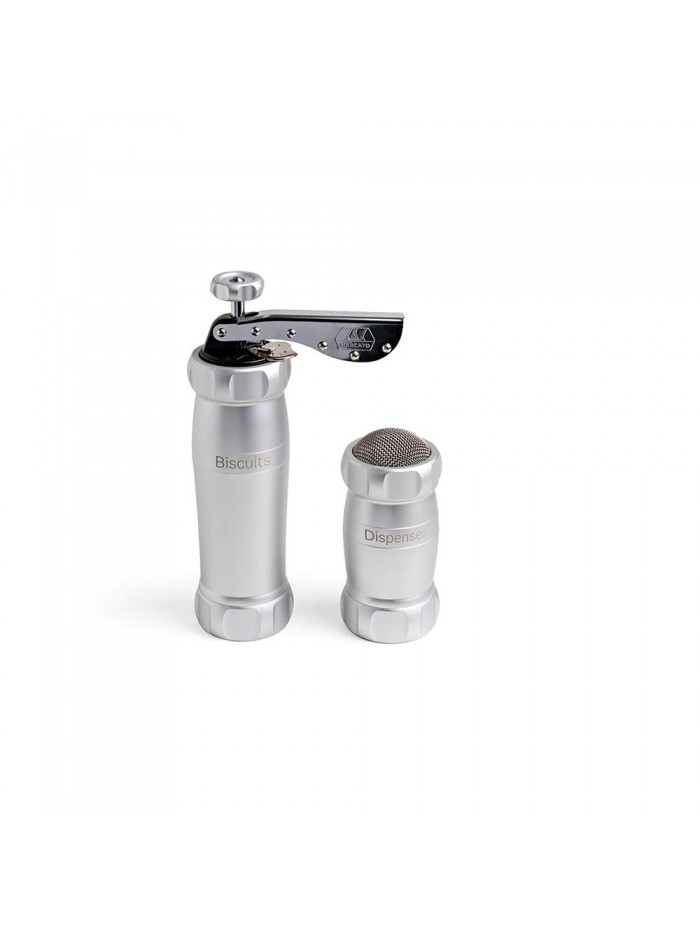 Machine à biscuits argent pour faire des biscuits authentiques et originals, facile à utiliser, elle est complet avec 20 moules différents et 10 recettes pour redécouvrir tout les saveurs anciennes des biscuits faits maison.