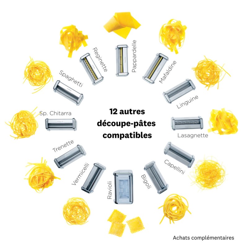 Emblème de la cuisine italienne, elle présente une technicité et un design remarquables. Les pâtes sont universelles, mais quand elles sont faites maison, elles ont vraiment une saveur spéciale ! La machine à pâtes Atlas+ permet de laminer la pâte et de réaliser 4 formes de pâtes grâce aux deux découpe-pâtes complémentaires fournis : les lasagnes d’une largeur de 150 mm, des fettuccine de 6,5 mm, des tagliolini de 1,5 mm et des spaghetti de 2mm.