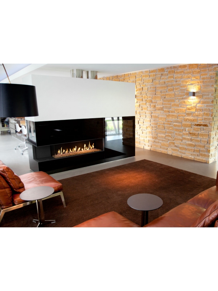 Ce foyer vitre latérale gauche, existe également en version latérale droite. Le S1250/370 est ainsi présenté en décor cailloux blancs sur fond verre céramique. Vous pourrez l'adapter aux différents décors et fonds proposés, pour personnaliser votre intérieur. Ce type de foyer peut être disposé de manière à créer une séparation de pièces.