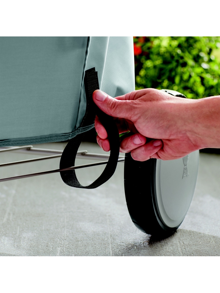 Une sangle en velcro s'attache au support triangulaire sous le barbecue pour maintenir la housse en place.
